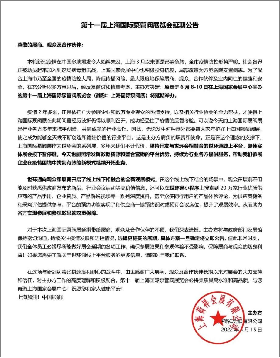 本輪疫情在中國多地爆發(fā)令人始料未及,上海3月以來更是形勢急轉,全市疫情防控形勢嚴峻。社會各界正被動員起來加入到這場病毒狙擊戰(zhàn),上海國家會展中心也積極投身抗疫,局部改造為方艙醫(yī)院安置病患。為了配合上海市乃至全國的疫情防控大局,降低傳播風險,最大限度地保障展商、觀眾、合作伙伴及業(yè)內同仁的健康和安全,在充分聽取多方意見后,經反復商討和慎重考慮,上海國際泵閥展主辦方決定:原定于6月8-10日在上海國家會展中心舉辦的第十一屆上海國際泵管閥展覽會(簡稱:上海國際泵閥展)將延期舉辦。