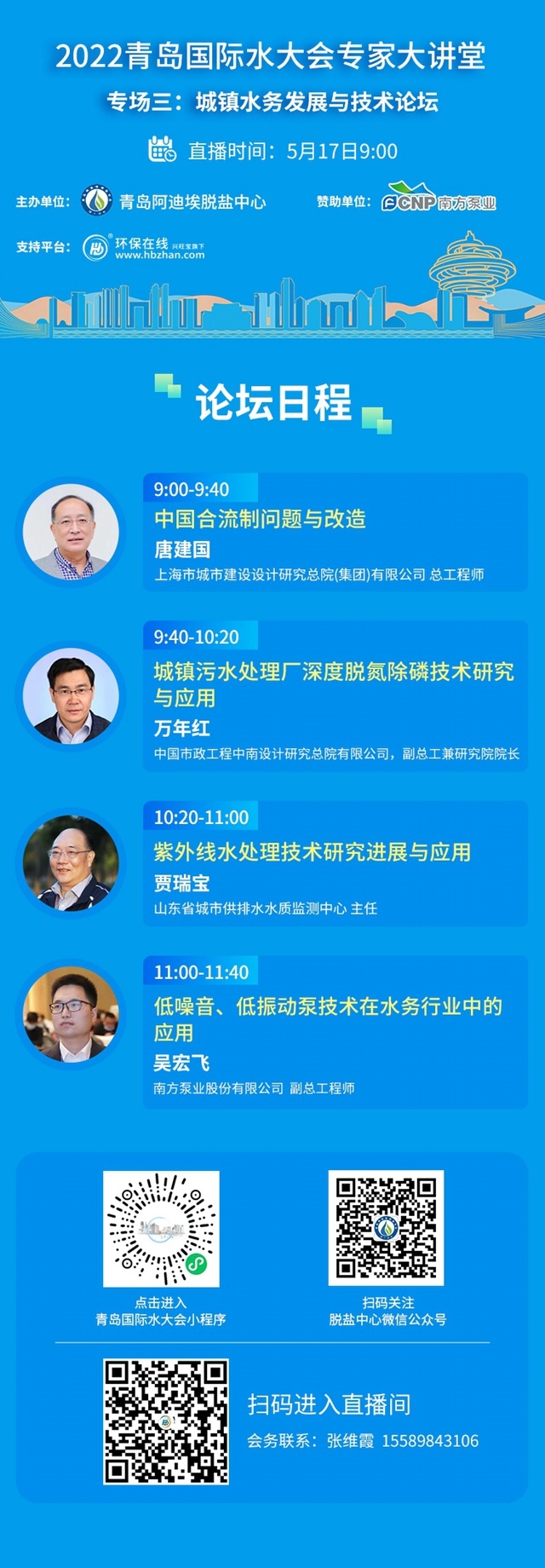 海水淡化與濃鹽水綜合利用論壇、工業(yè)節(jié)水與污水資源化論壇都看了吧,相信2022青島國際水大會的系列專家大講堂的專業(yè)調性已經毋庸贅述了。5月17日,青島國際水大會系列專家大講堂之專場三:城鎮(zhèn)水務發(fā)展與技術論壇 即將高調開場。