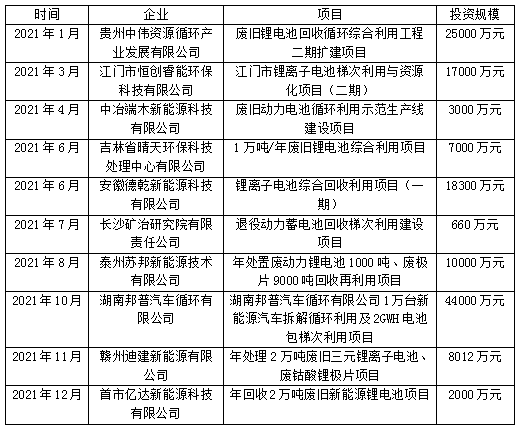動力電池回收市場廣闊,各個企業(yè)蓄勢待發(fā)。2015年是新能源汽車銷售元年,從那時起,新能源汽車的銷量不斷上漲,相應(yīng)的,裝在新能源汽車上的動力電池,經(jīng)過4-5年的使用,也迎來了退役時刻。根據(jù)數(shù)據(jù)顯示,2020年我國動力電池累計退役量約20萬噸,2025年累計退役量將達78萬噸。面對不斷增長的廢舊電池退役量,行業(yè)內(nèi)企業(yè)紛紛投資擴大回收產(chǎn)能。據(jù)不完全統(tǒng)計,2021年規(guī)模以上的電池回收投資及擴建項目有10余項,其投資總規(guī)模接近13.5億元。
