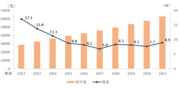 2012-2021年城鎮(zhèn)非私營(yíng)單位就業(yè)人員年平均工資及增速