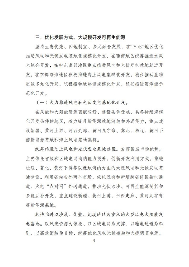 在“三北”地區(qū)優(yōu)化推動(dòng)風(fēng)電和光伏發(fā)電基地化規(guī)?;_(kāi)發(fā),在西南地區(qū)統(tǒng)籌推進(jìn)水風(fēng)光綜合開(kāi)發(fā),在中東南部地區(qū)重點(diǎn)推動(dòng)風(fēng)電和光伏發(fā)電就地就近開(kāi)發(fā),在東部沿海地區(qū)積極推進(jìn)海上風(fēng)電集群化開(kāi)發(fā)。
