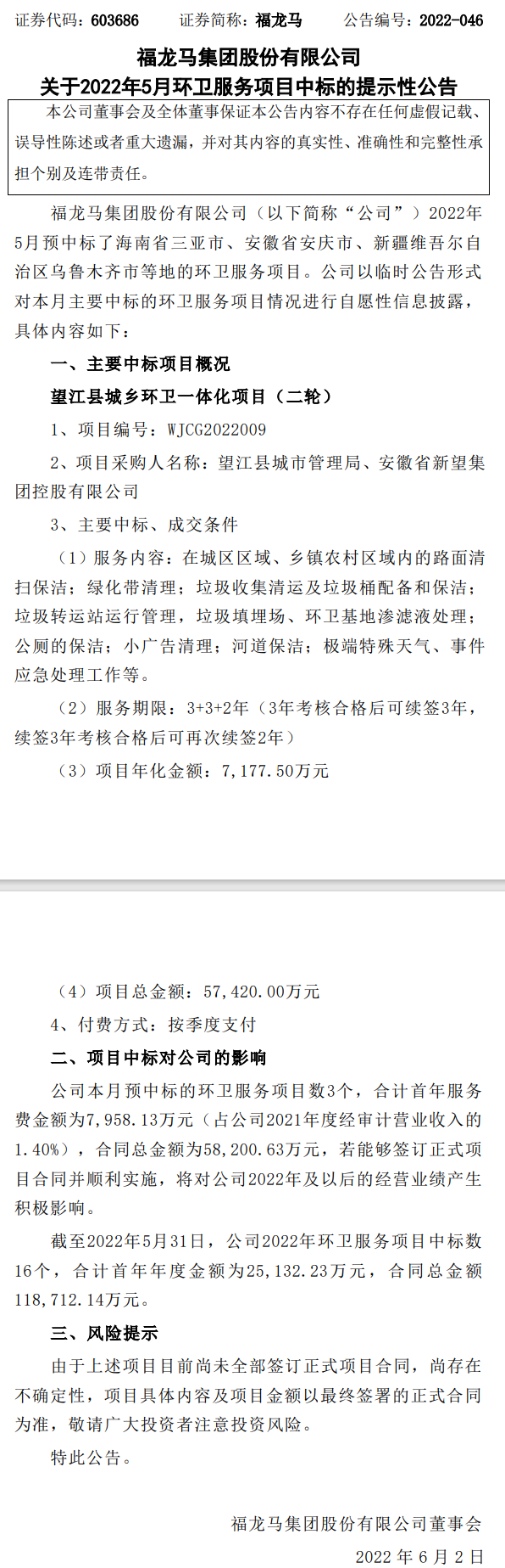 2022年6月2日,福龍馬集團(tuán)股份有限公司(下稱“福龍馬”)發(fā)布“關(guān)于2022年5月環(huán)衛(wèi)服務(wù)項目中標(biāo)的提示性公告”。