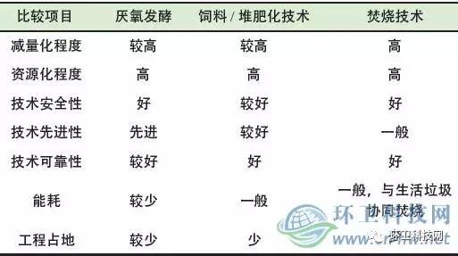 目前餐廚垃圾主要處理技術(shù)有填埋、焚燒、厭氧消化、飼料/堆肥化等??紤]到餐廚垃圾廢棄物的特點(diǎn),填埋術(shù)的適應(yīng)性均相對(duì)較差。因此針對(duì)厭氧消化、飼料化、焚燒技術(shù)進(jìn)行比較,結(jié)果見表1。