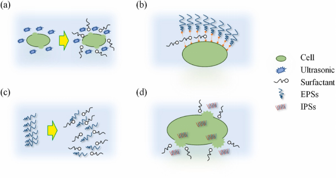 圖3 表面活性劑強化超聲波法提取的四種機(jī)理。(a)降低表面張力;(b)破壞EPSs與細(xì)胞體間的非共價鍵;(c)相似相溶作用;(d)破壞細(xì)胞壁或細(xì)胞膜結(jié)構(gòu)(來自原文)
