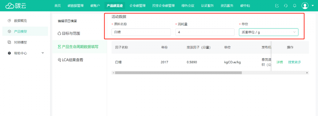 在【產(chǎn)品生命周期數(shù)據(jù)填寫】頁面,添加各類原材料的活動數(shù)據(jù),包括原料名稱、消耗量和單位。