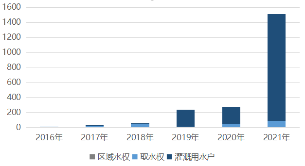 水權(quán)交易包含三種類型:區(qū)域水權(quán)、取水權(quán)和灌溉用水戶交易。其中,區(qū)域水權(quán)交易為政府主導(dǎo),交易主體通常為地方政府或水庫(kù)等,實(shí)現(xiàn)水資源跨區(qū)域調(diào)配,通常規(guī)模最大;取水權(quán)交易為用水主體主導(dǎo),包括企業(yè)等各類型對(duì)取水有需求的單位,規(guī)模較大;灌溉用水戶交易多為農(nóng)戶向村委會(huì)購(gòu)買(mǎi)水權(quán)或村組之間交易水權(quán),規(guī)模較小。