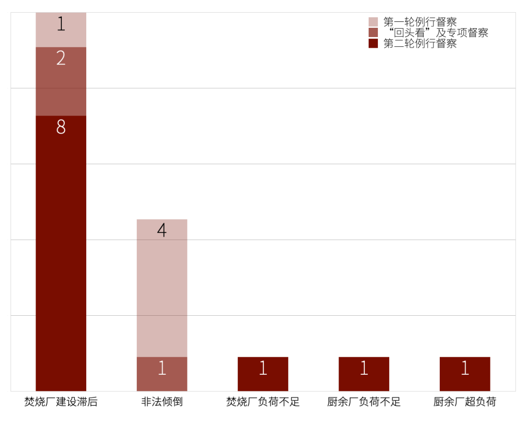 還有一些生活垃圾問(wèn)題在新的垃圾管理模式下爆發(fā)。其中,焚燒廠建設(shè)滯后問(wèn)題在第一次例行督察、“回頭看”及專項(xiàng)督察和第二次例行督察分別出現(xiàn)1次、2次、8次,愈演愈烈;還有一些生活垃圾問(wèn)題在2020年5月至2022年6月期間的第二輪例行督察中首次出現(xiàn),比如焚燒廠負(fù)荷不足、廚余廠負(fù)荷不足、廚余廠超負(fù)荷。