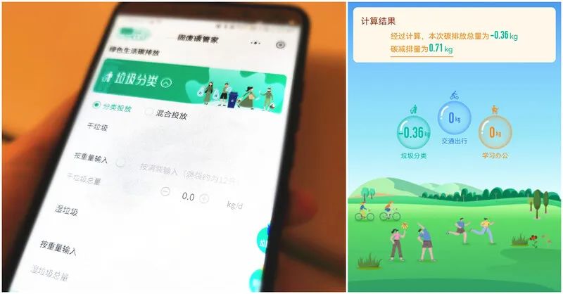 比如分類(lèi)投放了5千克干垃圾、5千克濕垃圾、5千克塑料、5千克玻璃后,碳排放總量為-12.31千克,而混合投放20千克垃圾的碳排放總量為7千克,因此碳減排量為19.31千克。