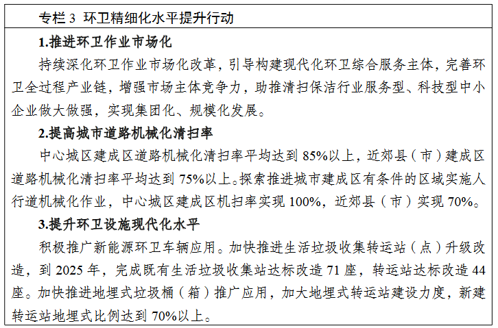 鼓勵(lì)推廣城鄉(xiāng)環(huán)衛(wèi)一體化,2025 年實(shí)現(xiàn)城鄉(xiāng)環(huán)衛(wèi)一體化作業(yè)區(qū)域占比不低于 50%。持續(xù)深化環(huán)衛(wèi)作業(yè)設(shè)施設(shè)備科技化、環(huán)衛(wèi)工人年輕化、監(jiān)管服務(wù)智慧化“三化”建設(shè),著力構(gòu)建結(jié)構(gòu)合理、技術(shù)先進(jìn)、能力充足的環(huán)衛(wèi)設(shè)施設(shè)備和環(huán)衛(wèi)隊(duì)伍保障體系,打造成都環(huán)衛(wèi)產(chǎn)業(yè)品牌,爭(zhēng)創(chuàng)中國(guó)最干凈城市。