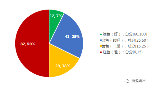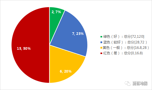 30個(gè)城市平均分26.0分,中位數(shù)得分17.8分。垃圾分類(lèi)等級(jí)為好的城市2個(gè),較好的城市8個(gè),共占33%,差的城市有15個(gè),占50%,垃圾分類(lèi)表現(xiàn)總體處于低水平。