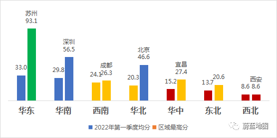 華東區(qū)、華南區(qū)因新加入的蕪湖、馬鞍山、東營(yíng)、佛山得分較低,平均分略有下降,西南、華北、華中、東北和西北平均分均有所增長(zhǎng)。圖 3 七大片區(qū)均分和區(qū)域最高分城市