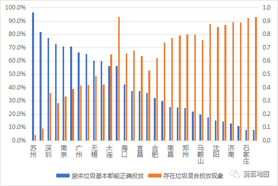 蘇州廚余垃圾正確投放率超過(guò)90.0%,武漢、石家莊隨手拍結(jié)果中顯示存在多種垃圾混合投放的比例超過(guò)90%。圖 4 30個(gè)城市觀查到廚余垃圾正確投放和混合投放隨手拍占比