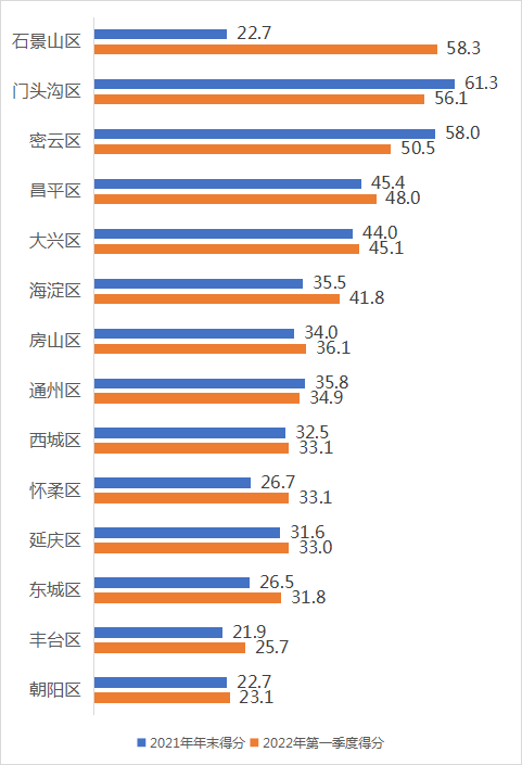 納入本期指數(shù)計(jì)算的北京市隨手拍共4235條,覆蓋十六個(gè)區(qū)3611個(gè)小區(qū),去除覆蓋度不足0.05%的順義區(qū)和平谷區(qū),十四區(qū)中得分最高的是石景山區(qū),58.3分,朝陽(yáng)區(qū)最低,23.1分,全市各區(qū)平均分39.3.,城六區(qū)平均分35.6分。和2021年年末相比,各區(qū)平均分上升了3.7分,城六區(qū)平均分上升了8.7分。14個(gè)區(qū)的得分有所增長(zhǎng),其中石景山區(qū)增幅最大,得益于1月以來(lái)石景山區(qū)為迎接2022年冬奧會(huì)、冬殘奧會(huì),區(qū)城管委推進(jìn)的監(jiān)督管理智能化、推進(jìn)引導(dǎo)宣傳精細(xì)化、推進(jìn)社會(huì)參與常態(tài)化等舉措。圖 21 北京市11區(qū)2022年第一季度垃圾分類(lèi)指數(shù)得分