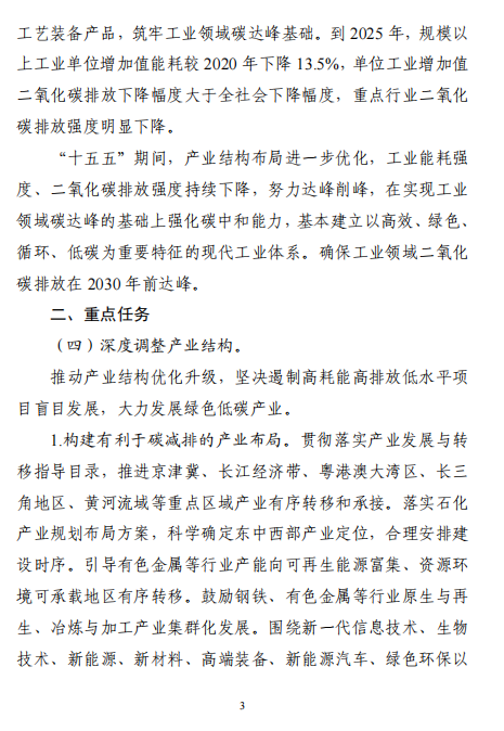 到2025年,規(guī)模以上工業(yè)單位增加值能耗較2020年下降13.5%,單位工業(yè)增加值二氧化碳排放下降幅度大于全社會(huì)下降幅度,重點(diǎn)行業(yè)二氧化碳排放強(qiáng)度明顯下降。