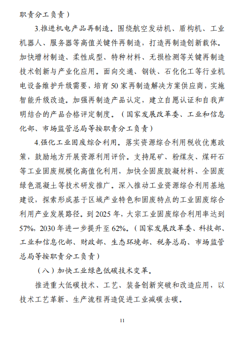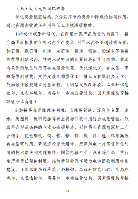 “十五五”期間,產(chǎn)業(yè)結(jié)構(gòu)布局進(jìn)一步優(yōu)化,工業(yè)能耗強(qiáng)度、二氧化碳排放強(qiáng)度持續(xù)下降,努力達(dá)峰削峰,在實(shí)現(xiàn)工業(yè)領(lǐng)域碳達(dá)峰的基礎(chǔ)上強(qiáng)化碳中和能力,基本建立以高效、綠色、循環(huán)、低碳為重要特征的現(xiàn)代工業(yè)體系。確保工業(yè)領(lǐng)域二氧化碳排放在2030年前達(dá)峰。方案指出,加強(qiáng)再生資源循環(huán)利用。實(shí)施廢鋼鐵、廢有色金屬、廢紙、廢塑料、廢舊輪胎等再生資源回收利用行業(yè)規(guī)范管理,鼓勵(lì)符合規(guī)范條件的企業(yè)公布碳足跡。延伸再生資源精深加工產(chǎn)業(yè)鏈條,促進(jìn)鋼鐵、銅、鋁、鉛、鋅、鎳、鈷、鋰、鎢等高效再生循環(huán)利用。研究退役光伏組件、廢棄風(fēng)電葉片等資源化利用的技術(shù)路線和實(shí)施路徑。圍繞電器電子、汽車等產(chǎn)品,推行生產(chǎn)者責(zé)任延伸制度。推動(dòng)新能源汽車動(dòng)力電池回收利用體系建設(shè)。