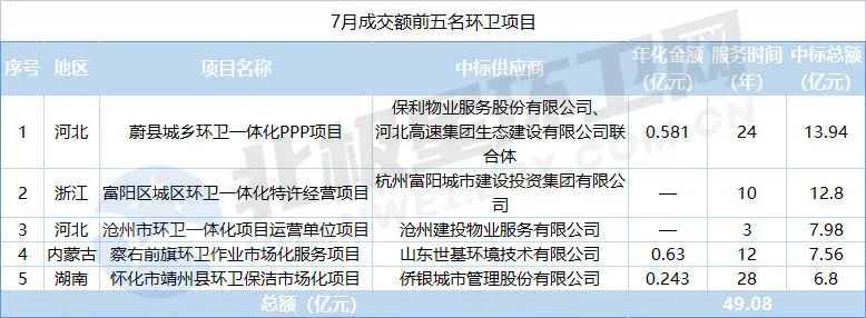 7月共開出2個10億+項目,分別是13.94億元的河北蔚縣城鄉(xiāng)環(huán)衛(wèi)一體化PPP項目和12.8億元的浙江富陽區(qū)城區(qū)環(huán)衛(wèi)一體化特許經營項目,這兩個項目分別被保利物業(yè)、河北高速聯合體以及杭州富陽城投收入囊中。
