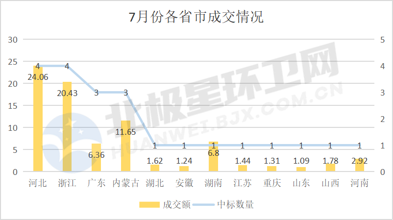 眾所周知,河北、浙江、廣東地區(qū)環(huán)衛(wèi)市場一直相當火熱,7月也不例外,河北、浙江省均成交4個項目,成交額分別是24.06億元、20.43億元,榮獲冠、亞軍。