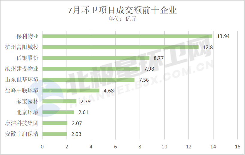 通過7月前十名排行榜可以看出,物企火力全開,強勢拿單,在環(huán)衛(wèi)市場的份額越來越重,老牌環(huán)衛(wèi)企業(yè)也悉數在列,持續(xù)拿標,發(fā)揮比較穩(wěn)定。
