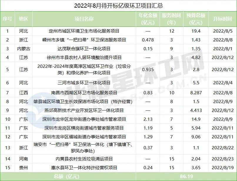 除此之外,北極星環(huán)衛(wèi)網還統(tǒng)計了8月待開標的億級環(huán)衛(wèi)項目,預算總額約86.2億元,主要分布在華北地區(qū)和東南地區(qū)。