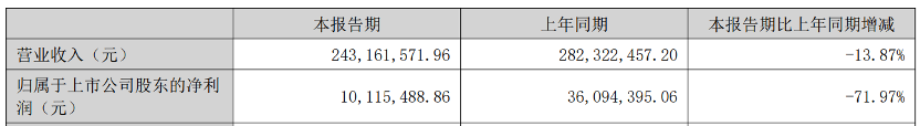 公司上半年度實(shí)現(xiàn)營(yíng)業(yè)收入24,316.16 萬元,同比下降 13.87%;實(shí)現(xiàn)歸屬于上市公司股東的凈利潤(rùn) 1,011.55 萬元,同比下降 71.97%。