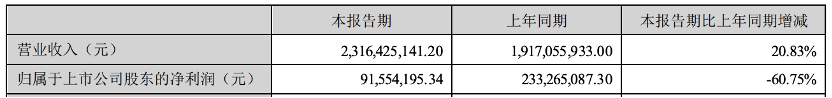 公司上半年?duì)I業(yè)收入為23.16億元,同比增長(zhǎng)20.83%;歸屬于掛牌公司股東的凈利潤(rùn)9155.42萬元,同比下降60.75%。