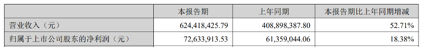 公司上半年?duì)I業(yè)收入為6.24億元,同比增長(zhǎng)52.71%;歸屬上市公司股東的凈利潤(rùn)7263萬元,同比增長(zhǎng)18.38%。