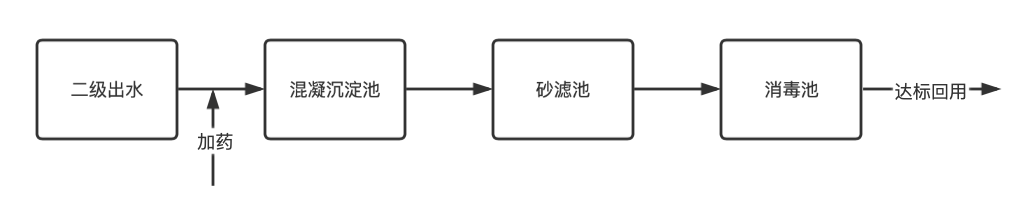 污水廠二級出水通過投加絮凝劑,經(jīng)混凝、絮凝后,水體中剩余微小顆粒和膠態(tài)物質凝聚成較大絮凝體,繼而在沉淀池進行沉淀,再通過濾池的過濾作用得以去除。過濾后的水被送入消毒池,用臭氧或氯等消毒,殺滅細菌和病毒,然后將達標的處理水送入中水道回用。