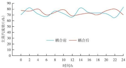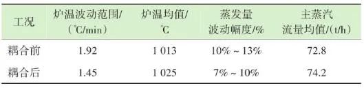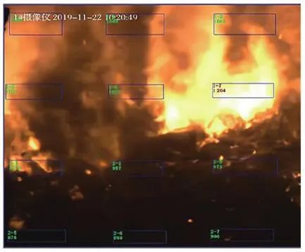 生活垃圾焚燒爐的排放物在滿足GB 18485—2014 生活垃圾焚燒污染控制標(biāo)準(zhǔn)的前提下,為保障焚燒爐的長期安全運(yùn)行、汽機(jī)系統(tǒng)的穩(wěn)定高效運(yùn)轉(zhuǎn),通常通過爐溫和主蒸汽流量這兩個因素來判斷鍋爐運(yùn)行是否良好。以下工況為某項(xiàng)目單臺750 t/d生活垃圾焚燒爐在紅外熱成像管理系統(tǒng)應(yīng)用前、應(yīng)用后兩段時期的實(shí)際運(yùn)行參數(shù),以此實(shí)例來解析該系統(tǒng)的運(yùn)行效果。該項(xiàng)目額定主蒸汽流量為74 t/h。如圖10所示,藍(lán)色實(shí)線為耦合前24 h變化率波動范圍,紅色實(shí)線為耦合后24 h變化率波動范圍。爐溫變化率指的是焚燒爐上、中、下3層共計(jì)9個溫度測點(diǎn)的熱電偶反饋溫度在每分鐘內(nèi)升高或降低的溫度值,而溫度變化率波動范圍指的是單位時間內(nèi)溫度變化率最高值與最低值之間的溫度差,該差值越大表明爐溫波動越大,即工況越不穩(wěn)定,波動范圍越小表明工況越平穩(wěn)。此期間溫度也一直未低于環(huán)保部要求的最低限(850 ℃/2 s),均介于950~1 050 ℃。焚燒爐主蒸汽流量曲線如圖11所示,左側(cè)縱坐標(biāo)為主蒸汽流量,額定蒸發(fā)量74 t/h。圖中藍(lán)色實(shí)線為紅外熱成像系統(tǒng)與ACC系統(tǒng)耦合前24 h的主蒸汽流量曲線,紅色虛線為紅外熱成像系統(tǒng)與ACC系統(tǒng)耦合后24 h的主蒸汽流量曲線。表1中參數(shù)可以計(jì)算出耦合前后焚燒爐爐溫波動范圍相對縮減了24.5%,焚燒爐爐溫均值提高了1.2%,蒸發(fā)量波動幅度縮減了3個百分點(diǎn),主蒸汽流量提高了1.4 t/h。經(jīng)過對主要運(yùn)行參數(shù)的定量分析,可以看出結(jié)合了紅外熱成像系統(tǒng)的ACC系統(tǒng)在功能性和穩(wěn)定性上有顯著提升。表1 重要運(yùn)行參數(shù)統(tǒng)計(jì)基于目前紅外熱成像管理系統(tǒng)的功能,正在逐步進(jìn)行焚燒爐溫度場重構(gòu)工作,對于紅外探頭收集的大量溫度點(diǎn)實(shí)時數(shù)據(jù)進(jìn)行整合并進(jìn)行紅外溫度顯示。傳感器擁有1 440×1 080個像素,其中每個像素都有對應(yīng)的溫度值,該溫度值隨著目標(biāo)溫度的變化在800~1 600 ℃對應(yīng)變化,那么我們就可以將800~1 600 ℃這個范圍內(nèi)的溫度數(shù)據(jù)映射到顏色空間中特定的彩色序列,只要在程序中明確規(guī)定溫度和顏色之間的映射函數(shù)和映射表即可實(shí)現(xiàn)相應(yīng)的偽彩顯示,即熱像圖的形式。這樣可為運(yùn)行人員提供更為直觀、立體的參考依據(jù),待溫度場重構(gòu)系統(tǒng)成熟后,再與ACC系統(tǒng)進(jìn)行結(jié)合,進(jìn)一步提高全廠的自動化程度。紅外熱成像管理系統(tǒng)在生活垃圾焚燒控制領(lǐng)域,與傳統(tǒng)ACC系統(tǒng)經(jīng)過合理的設(shè)計(jì)、安裝、邏輯耦合后,對焚燒自動化有以下幾個方面的改變和提升。1)視野擴(kuò)大。改變探頭安裝位置后,成像角度由仰視變?yōu)楦┮?,拓寬了爐內(nèi)火焰視場角度?;鹧娉上裥螤钣伞耙幻婊饓Α?提升為“一片火?!?。在具備最基本的“遠(yuǎn)程看火”功能前提下,為運(yùn)行人員提供更強(qiáng)有力的參考依據(jù)。2)測溫準(zhǔn)確。紅外熱成像原理相比傳統(tǒng)光學(xué)成像原理,增加了溫度反饋功能。利用軟件管理系統(tǒng),將溫度信號解析,并與實(shí)際區(qū)域一一對應(yīng)。3)靈活性高。溫度測點(diǎn)的選定可通過管理軟件任意選擇,調(diào)試結(jié)束后仍可根據(jù)實(shí)際工況進(jìn)行設(shè)置和改變。4)耦合性強(qiáng)。紅外熱成像管理系統(tǒng)除現(xiàn)有功能外更像是一個平臺,可以對現(xiàn)有溫度參數(shù)和火焰狀態(tài)的大量數(shù)據(jù)進(jìn)行進(jìn)一步提升和利用,例如正在進(jìn)行的溫度場成像功能優(yōu)化和升級工作。5)效益提升。紅外熱成像管理系統(tǒng)融入ACC系統(tǒng)后,對焚燒爐溫度、鍋爐主蒸汽流量的穩(wěn)定性有顯著提升。對減少運(yùn)行人員工作量、增加產(chǎn)汽量、發(fā)電量等焚燒廠經(jīng)濟(jì)效益方面有不同程度提升。