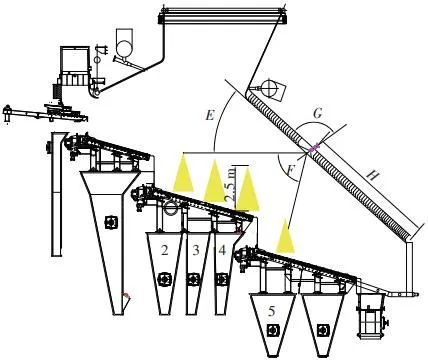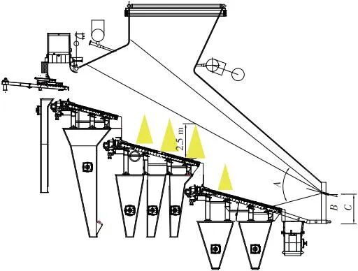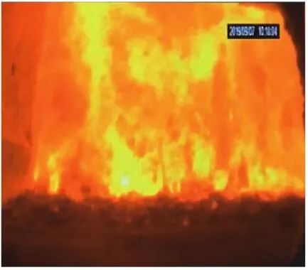 當(dāng)前生活垃圾焚燒爐廣泛采用的爐膛火焰監(jiān)視系統(tǒng)基本上都是由早期應(yīng)用在水泥廠、鋼鐵廠的加熱爐、退火爐和氧化鋁廠等行業(yè)內(nèi)的高溫看火工業(yè)電視演變升級而來。內(nèi)窺式數(shù)字高清爐膛火焰監(jiān)視系統(tǒng)成像裝置主要由耐高溫針孔電動鏡頭、寶石物鏡、光學(xué)濾光片、光圈焦距調(diào)節(jié)器等組成,配有電控推進(jìn)器、氣源控制柜、光端機(jī)等輔助設(shè)備。其核心問題是如何在生活垃圾焚燒爐的高溫、多塵、強(qiáng)腐蝕環(huán)境中長周期穩(wěn)定運(yùn)行,保證火焰畫面不丟包、不失真。1)優(yōu)勢特性分析。一是技術(shù)成熟、運(yùn)行穩(wěn)定。隨著我國近一二十年間生活垃圾發(fā)電廠的興建,爐膛火焰監(jiān)視系統(tǒng)的技術(shù)也處于不停地優(yōu)化和迭代之中,目前已能滿足穩(wěn)定、可靠的要求。其中常規(guī)配置參數(shù)為攝像頭300 萬像素,響應(yīng)時間2 s,光圈(F數(shù))1.6,焦距2.4 mm。二是工作環(huán)境好。爐膛火焰監(jiān)視器探頭通常安裝于焚燒爐后墻,所處位置是垃圾燃燒最末端,常規(guī)工況下探頭周圍煙氣溫度通常<600 ℃。較之焚燒爐其他高溫環(huán)境已算“宜居地帶”。三是維護(hù)量小。焚燒爐后墻幾乎沒有結(jié)焦現(xiàn)象,常規(guī)爐膛火焰監(jiān)視探頭開孔位置僅存有因爐膛偶爾正壓時煙氣外冒造成的積灰,積灰量不大,清理工作較為輕松。2)劣勢特性分析。一是參數(shù)單一。因垃圾焚燒行業(yè)爐型構(gòu)造和燃燒成分的特殊性,垃圾焚燒爐長期采用的火焰探頭利用的是光學(xué)成像原理,運(yùn)行人員僅能通過觀察火焰形狀和位置來判斷焚燒爐工況,無法得到多維度參數(shù)。二是視角局限。爐膛火焰探頭通常位于焚燒爐后墻,安裝角度朝向爐內(nèi)成斜向上方向,與水平線夾角15°左右,探頭視場角通常>60°。以某大型列動順推爐排焚燒爐為例,在此仰視角度下可以看到爐排燃燒段尾部、燃燼段前部兩面明顯的火焰幕墻,由于火焰鋒面遮擋,很難觀察到燃燒段中前部的火焰狀況。 以某單臺750 t/d大型列動順推爐排焚燒爐中爐膛火焰監(jiān)視器安裝位置和顯示畫面為實(shí)例,具體分析火焰成像狀態(tài)。其實(shí)際火焰成像畫面見圖1。成像角度是由焚燒爐后墻探頭位置向上仰視爐膛。因焚燒工況十分良好,靠近后墻的燃燼段區(qū)域幾乎沒有明火,燃燒段尾部成一面豎直、光亮的黃紅色火焰鋒面,高度約為2.5 m。對應(yīng)的爐膛火焰監(jiān)視器安裝示意如圖2所示。爐膛火焰探頭安裝在焚燒爐后墻,安裝位置與后墻觀火平臺地面距離為C(m)。開孔傾角與水平方向夾角為B(°),有效視場角為A(°)。圖2中由黃色填充的三角形區(qū)域代表正常燃燒火焰,其中標(biāo)注高度2.5 m的區(qū)域?yàn)槿紵隣t排尾部火焰,即為圖1所顯示的火焰鋒面。顯然,從爐膛火焰監(jiān)視器向上望去,燃燒段前部、中部火焰為視野盲區(qū)。由于被燃燒段尾部火焰鋒面遮擋,通過火焰監(jiān)視器通常只能看到燃燒段尾部、燃燼段前部這兩個區(qū)域的火焰。