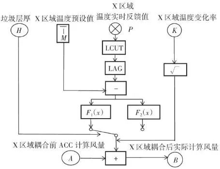 根據(jù)工藝設(shè)計(jì)和焚燒爐結(jié)構(gòu),從燃燒段至燃燼段前部為垃圾的燃燒區(qū)域,爐排底部依次有4行風(fēng)室,即圖7中所示2、3、4和5行風(fēng)室,每行各有3列,共計(jì)12個風(fēng)室。按照前述的項(xiàng)目實(shí)例,圖6中的12個紅外溫度測點(diǎn),可以得到依次對應(yīng)12個風(fēng)室上部的火焰圖像和燃燒溫度。在傳統(tǒng)ACC系統(tǒng)中,一次風(fēng)的理論供風(fēng)量主要依據(jù)垃圾熱值、垃圾占比、蒸發(fā)量設(shè)定值、鍋爐熱效率等參數(shù)計(jì)算得到,在得到理論計(jì)算值后,會根據(jù)鍋爐負(fù)荷、垃圾料層厚度、垃圾濕度、燃燒和燃燼段上部溫度等參數(shù)的波動對理論計(jì)算值進(jìn)行修正。其中溫度參數(shù)是由安裝在焚燒爐墻兩側(cè)的熱電偶反饋而來,爐溫?zé)犭娕嫉拈L度一般為1.0~1.3 m,除去爐墻壁厚,熱電偶露出爐內(nèi)的長度一般在250 mm左右,熱電偶材質(zhì)為鎳鉻-鎳硅,熱電偶前端耐磨頭長度為250~300 mm,耐磨頭材質(zhì)為鈷60。由于能夠反饋的溫度只能是熱電偶周圍溫度,因此會造成3點(diǎn)限制:①測點(diǎn)數(shù)量有限,若熱電偶數(shù)量增加,鍋爐開孔數(shù)量也要隨之上升,通常燃燒和燃燼區(qū)域安裝熱電偶數(shù)量為4~6支;②耦合性較高,抗干擾能力較低,其中的溫度修正系數(shù)雖然權(quán)重占比不大,但由于熱電偶數(shù)量有限,其單一溫度值對整體其他區(qū)域有連鎖影響,因此局部溫度與局部風(fēng)量無法一一獨(dú)立對應(yīng);③準(zhǔn)確性存在衰減,熱電偶的原理是溫度信號轉(zhuǎn)換成熱電動勢信號,通過二次儀表呈現(xiàn)被測介質(zhì)溫度。而隨著磨損、腐蝕的加重,其準(zhǔn)確性也逐漸衰減。其中鎳硅合金中的硅和鎳的優(yōu)先氧化是引起鎳鉻-鎳硅熱電偶熱電動勢超差、準(zhǔn)確性降低的主要原因。根據(jù)上述內(nèi)容,我們在得到理論計(jì)算風(fēng)量之后,針對每一段風(fēng)室進(jìn)行獨(dú)立的風(fēng)量修正。圖9中:M為對應(yīng)區(qū)域內(nèi)溫度設(shè)定值(℃);H為垃圾層厚度偏差百分比(%);P為對應(yīng)區(qū)域內(nèi)溫度實(shí)時反饋值(℃);K為對應(yīng)區(qū)域內(nèi)溫度變化率(℃/min);√ ̄為速度變化率高低限范圍(℃/min);LCUT為低切保護(hù)模塊(℃);LAG為高階濾波模塊(℃);A為理論計(jì)算風(fēng)量(m3/h);B為實(shí)際輸出計(jì)算風(fēng)量(m3/h)。
