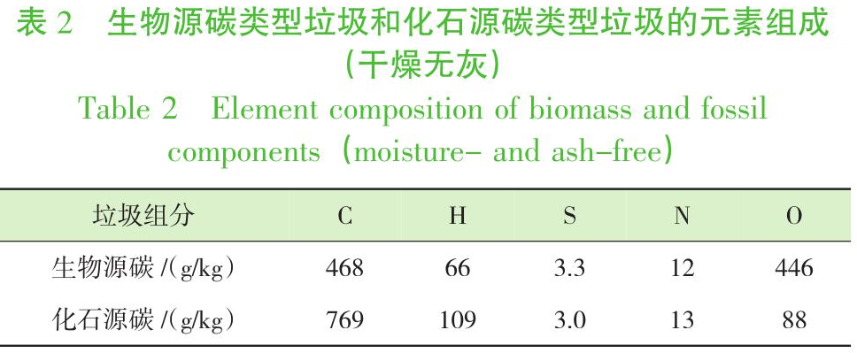1)本研究的碳排放計算參考了歐洲垃圾組分中的元素含量,而我國生活垃圾組分與歐洲地區(qū)存在差異,其中,我國生活垃圾組分中廚余含量高達50%,而歐洲地區(qū)垃圾中的廚余含量僅為25%左右。因此,C、H、S、N、O等元素含量參考值對我國不完全適用,計算過程存在低估生物源碳含量的可能性。