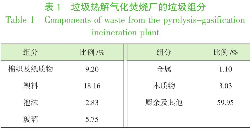 以舟山市某垃圾無害化處理項目為研究對象,該項目的垃圾焚燒系統(tǒng)采用立式旋轉(zhuǎn)熱解氣化焚燒爐對周邊城市生活垃圾及部分工業(yè)可燃垃圾進行焚燒處理,處理規(guī)模為28 t/d,無須添加輔助化石燃料;并配建1.8 t/h臥式余熱鍋爐,給水量1.854 t/h,給水溫度20℃,蒸汽壓力0.7 MPa,蒸汽溫度170℃;項目渣產(chǎn)量為3.1 t/d,灰產(chǎn)量為1.44 t/d;垃圾滲瀝液產(chǎn)量為3.5 m3/d,其CODcr濃度為6000 mg/L,垃圾滲瀝液回噴至焚燒爐內(nèi)進行處理。該項目新鮮垃圾的含水率為60%,詳細入爐垃圾組份見表1。