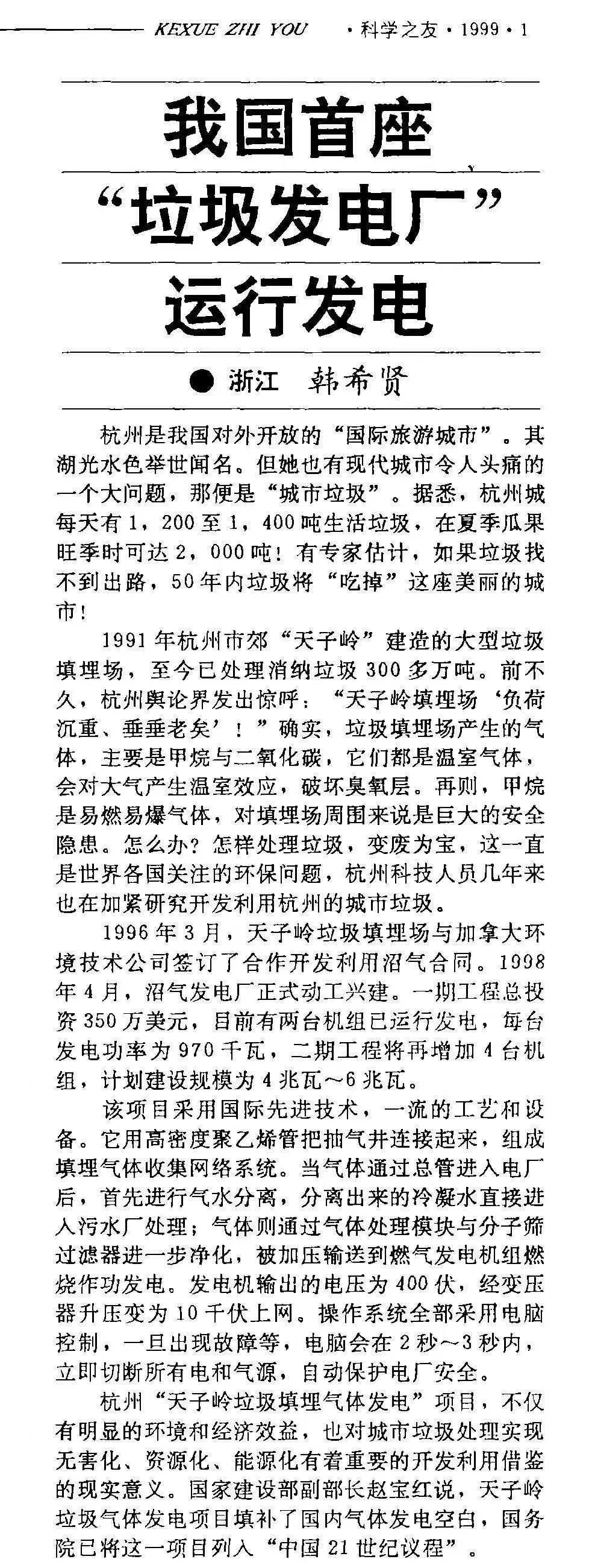 報(bào)道原文表示,杭州“天子嶺垃圾填埋氣體發(fā)電”項(xiàng)目不僅有明顯的環(huán)境和經(jīng)濟(jì)效益,也對(duì)城市垃圾處理實(shí)現(xiàn)無(wú)害化、資源化、能源化有著重要的開(kāi)發(fā)利用借鑒的現(xiàn)實(shí)意義。時(shí)任原建設(shè)部副部長(zhǎng)的趙寶紅說(shuō),天子嶺垃圾氣體發(fā)電項(xiàng)目填補(bǔ)了國(guó)內(nèi)氣體發(fā)電空白,國(guó)務(wù)院已將這一項(xiàng)目列入“中國(guó)21世紀(jì)議程”。