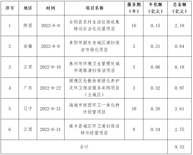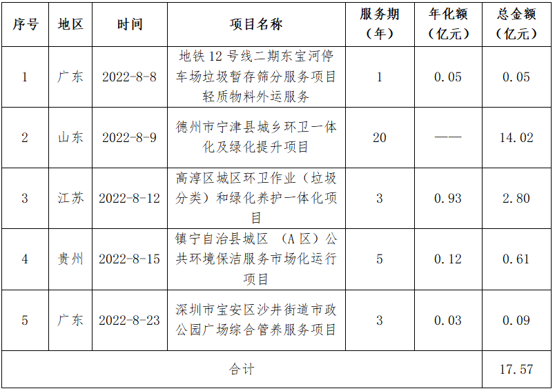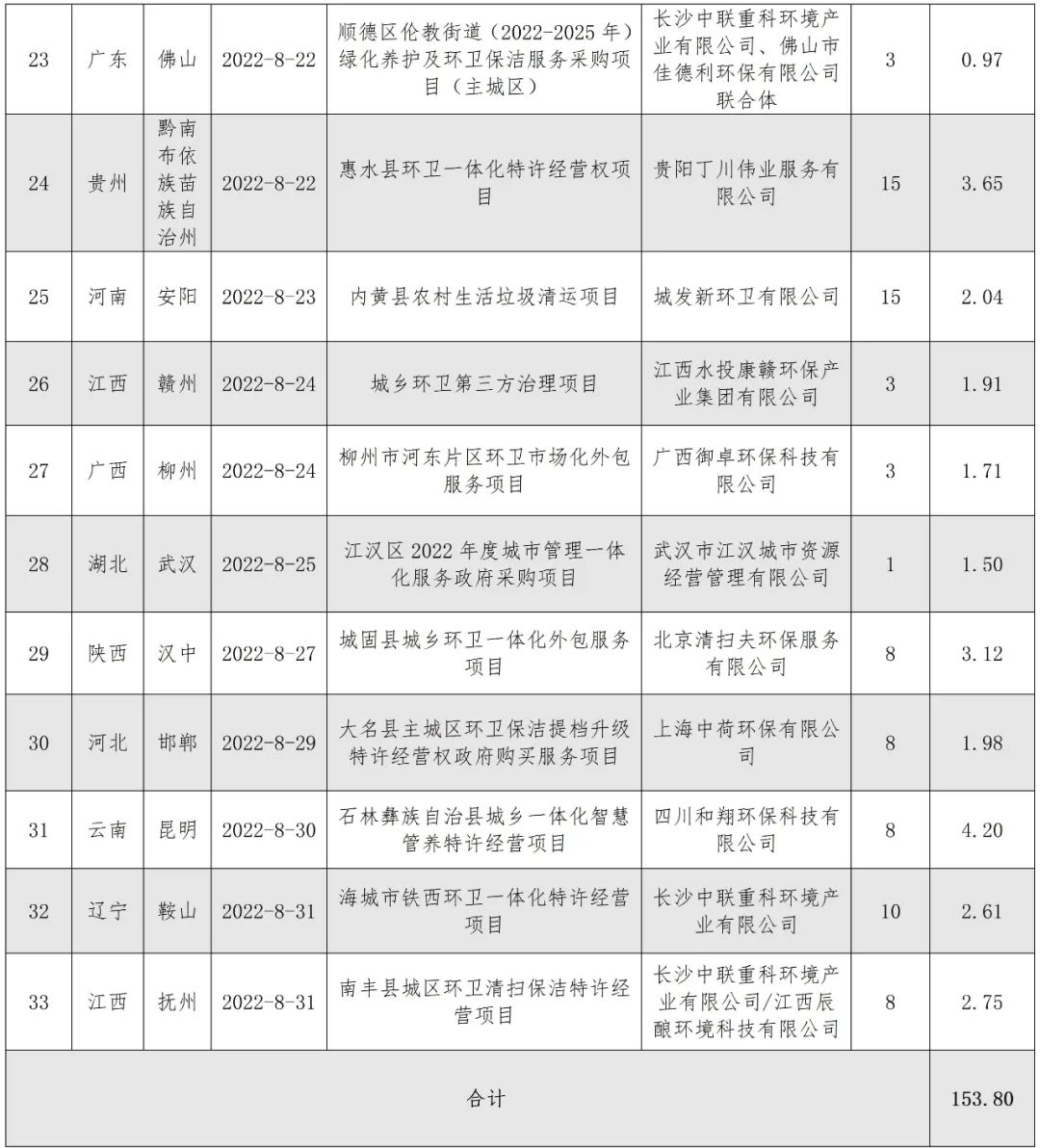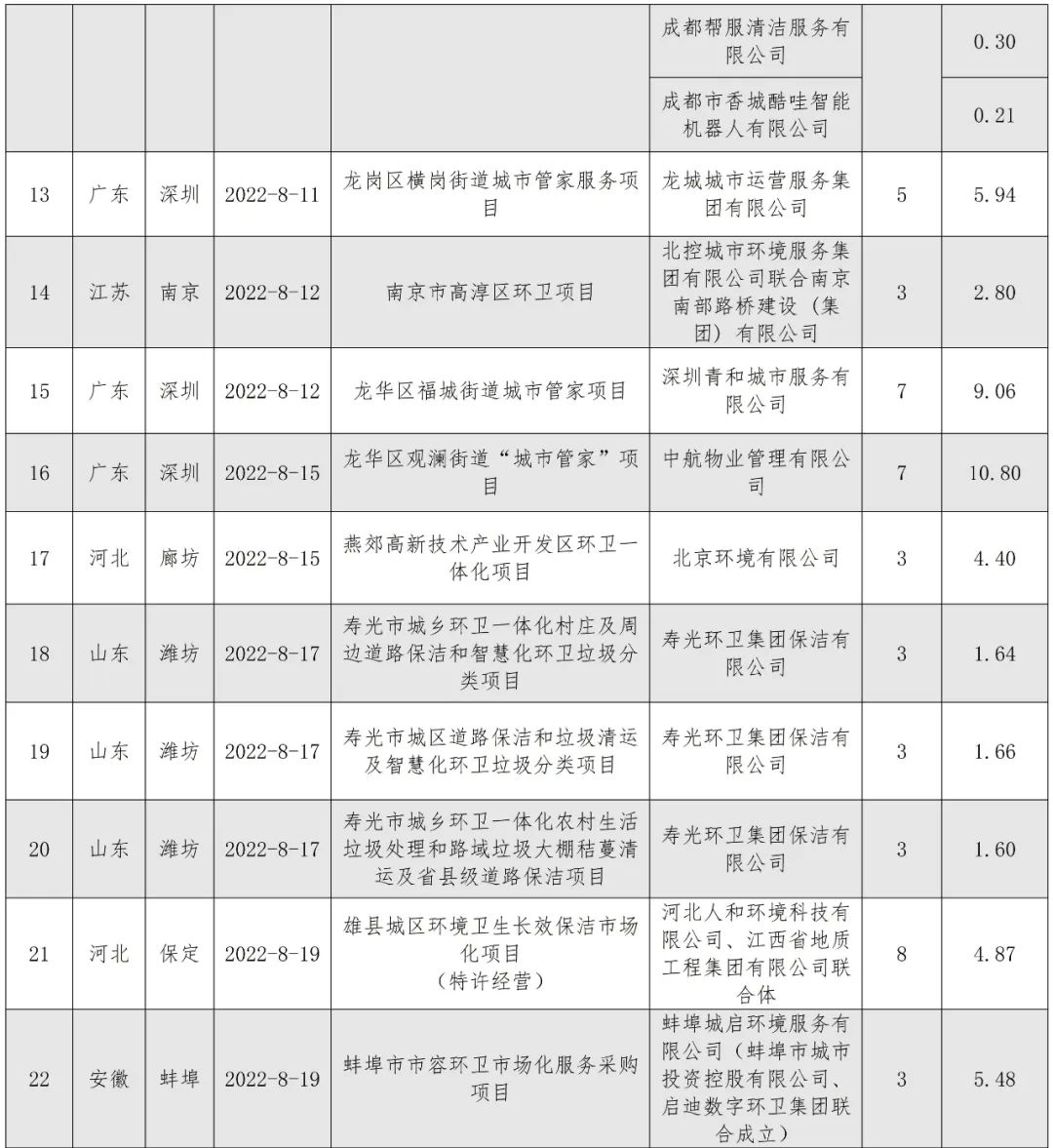 其中最典型的就是山東省德州市寧津縣城鄉(xiāng)環(huán)衛(wèi)一體化及綠化提升項(xiàng)目,該項(xiàng)目服務(wù)期為20年,第一至第二年合同額預(yù)估為5682萬元,第三至二十年合同額預(yù)估為13.4514億元,合計金額14.0196億元。項(xiàng)目服務(wù)范圍包括但不限于寧津縣10座鄉(xiāng)鎮(zhèn)垃圾轉(zhuǎn)運(yùn)站的升級改造以及新建鄉(xiāng)鎮(zhèn)生活垃圾分類處理項(xiàng)目,鄉(xiāng)鎮(zhèn)駐地及國省干道綠化提升工程以及縣城綠化提升工程(包括福寧河公園提升改造、道路綠化及小游園提升改造、康寧湖提升改造工程)及其他環(huán)衛(wèi)服務(wù)。據(jù)環(huán)衛(wèi)科技網(wǎng)粗略統(tǒng)計,北控城市環(huán)境今年已中標(biāo)近20個環(huán)衛(wèi)項(xiàng)目,合計中標(biāo)金額超過48億元。在年度排行榜上,目前僅次于盈峰環(huán)境和僑銀股份,排在第三的位置。進(jìn)入2022年,盈峰環(huán)境和僑銀股份兩家環(huán)衛(wèi)龍頭企業(yè)延續(xù)了以往的強(qiáng)勢,幾乎每個月度排行都榜上有名。8月,盈峰環(huán)境和僑銀股份再次上榜,分別排在第5和第7的位置。盈峰環(huán)境當(dāng)月中標(biāo)6個環(huán)衛(wèi)項(xiàng)目,尤其在最后一天同時拿下遼寧省海城市鐵西環(huán)衛(wèi)一體化和江西省南豐縣城區(qū)環(huán)衛(wèi)清掃保潔兩個特許經(jīng)營項(xiàng)目,南北“雙響”收獲5.36億元。表3 盈峰環(huán)境8月中標(biāo)項(xiàng)目匯總
