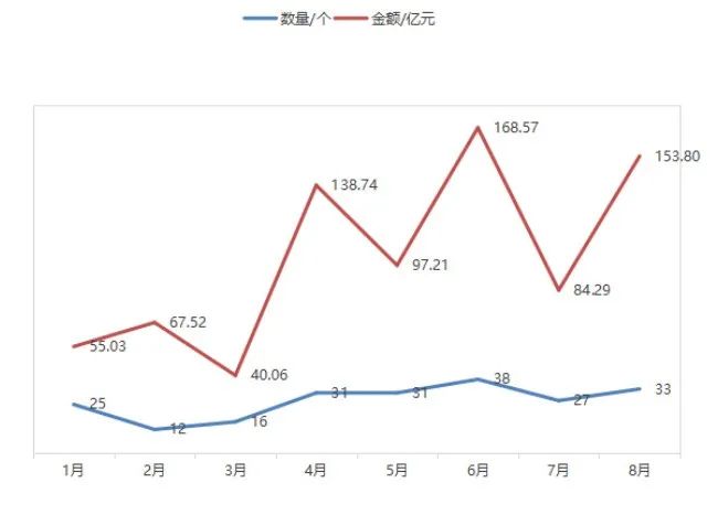 據(jù)環(huán)衛(wèi)科技網(wǎng)統(tǒng)計,8月,全國共開標(biāo)了33個億級環(huán)衛(wèi)項(xiàng)目,合計中標(biāo)金額153.80億元。當(dāng)月億級環(huán)衛(wèi)項(xiàng)目開標(biāo)數(shù)量和金額僅次于6月份,是今年第二高的月份。