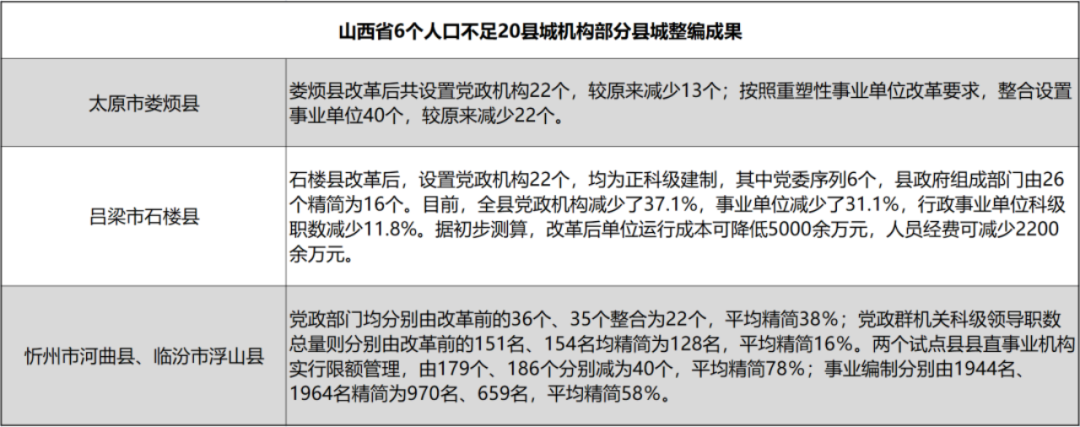 前兩年,安徽、湖南、山西、青海早早就開啟了人口小縣機(jī)構(gòu)編制改革,多個(gè)行政部門被撤,部分事業(yè)單位編制被縮減,有的縣域縮編人數(shù)甚至超過千人。
