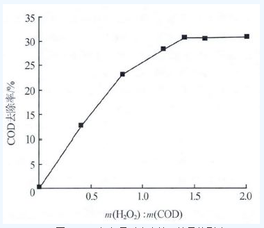 取一定量的廢水,僅加入不同量質量分數(shù)為30%的H2O2,考察H2O2的加入量對廢水COD 去除率的影響,結果如圖 1 所示。