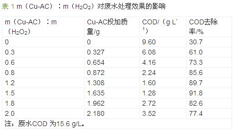 為了考察Cu -AC 與H2O2的協(xié)同作用,在m(H2O2) ∶m(COD) =1.4,反應溫度為30 ℃的條件下,改變Cu-AC 投加量,試驗研究了m(Cu-AC)∶m(H2O2)對廢水處理效果的影響,結果見表 1。