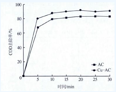 結果表明,Cu-AC 與AC 對COD 的去除率均隨時間的延長而提高,但Cu-AC 較AC 有更好的催化氧化效果,反應30 min 時COD 去除率趨于穩(wěn)定。