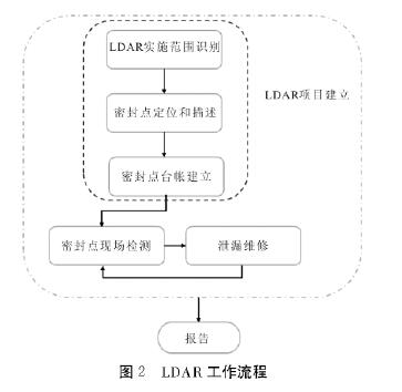 美國《石化企業(yè)泄漏檢測與修復(fù)工作指南》將LDAR工作流程劃分為LDAR項(xiàng)目建立、現(xiàn)場檢測和泄漏維修3個(gè)步驟,對(duì)其進(jìn)行進(jìn)一步拆解,可將LDAR工作流程劃分為LDAR實(shí)施范圍識(shí)別、密封點(diǎn)定位和描述、密封點(diǎn)臺(tái)賬建立、密封點(diǎn)現(xiàn)場檢測、泄漏點(diǎn)維修、出具報(bào)告6個(gè)步驟,如圖2所示。
