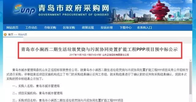 11月16日,據(jù)青島市公共資源交易中心消息,青島市小澗西二期生活垃圾焚燒與污泥協(xié)同處置擴能工程PPP項目已公布預(yù)中標(biāo)公示,上??岛悱h(huán)境股份有限公司為預(yù)成交供應(yīng)商。