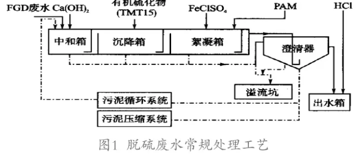 國內(nèi)脫硫廢水常規(guī)處理工藝如下:一般采用加石灰中和、絮凝、沉降處理后,經(jīng)澄清、PH調(diào)節(jié)達(dá)標(biāo)后回用或排放。