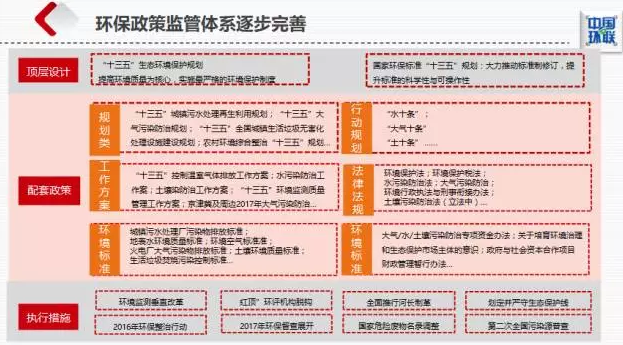 2017年以來,環(huán)保監(jiān)管體系重構(gòu):從頂層政策,如“十三五”生態(tài)環(huán)境保護規(guī)劃,到水、氣、固、土壤的配套政策,再到環(huán)保垂改、專項整治等具體措施,三位一體重構(gòu)環(huán)保政策監(jiān)管體系,強調(diào)治理效果,提升監(jiān)管力度。在責(zé)任主體、監(jiān)管體系、排污收費、排污許可、排污權(quán)交易等五個方面進行重大改革,從多個方面吸引社會力量共同改善環(huán)境質(zhì)量,把過去被動化、模糊化的管理變?yōu)榱酥鲃踊?、定量化、清晰化的管理?/p>