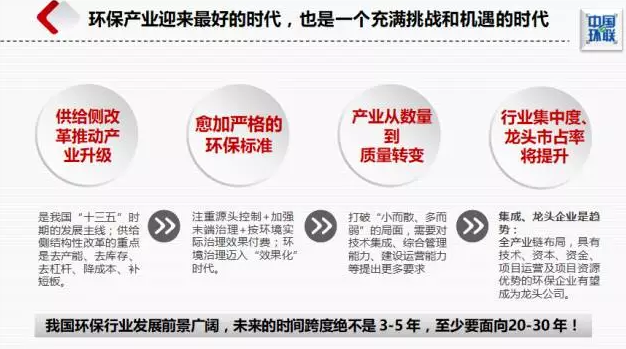 供給側(cè)改革是我國“十三五”時期的發(fā)展主線,而環(huán)保是推進供給側(cè)改革的重要手段。十九大進一步明確了“綠水青山就是金山銀山”的戰(zhàn)略思想,我國的環(huán)保產(chǎn)業(yè)發(fā)展正迎來最好的時代,環(huán)保標準將越來越高,環(huán)境治理邁入“效果化”時代,環(huán)保產(chǎn)業(yè)將經(jīng)歷從數(shù)量到質(zhì)量的變化。與此同時,并購持續(xù),行業(yè)集中度提升,擁有較強技術(shù)集成能力、綜合管理能力、建設(shè)運營能力的龍頭企業(yè)市場占有率將穩(wěn)步提升。我國環(huán)保行業(yè)發(fā)展前景廣闊,未來的時間跨度絕不是 3-5 年,至少要面向20-30 年。