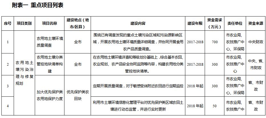 (三)明確治理修復任務清單:對于治理修復類農田,開展進一步詳細土壤環(huán)境調查,摸清具體污染源與污染分布情況,建立農田治理修復類地塊清單,將有關地塊移出基本農田區(qū)。分批次編制農田污染治理修復方案,明確農田土壤污染治理與修復重點任務、責任單位和分年度實施計劃,建立農田土壤污染治理與修復項目庫。明確重點任務清單,確定年度實施計劃,分批次開展農田土壤治理修復工作。