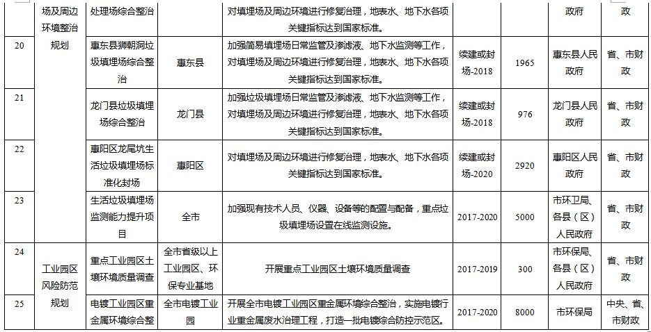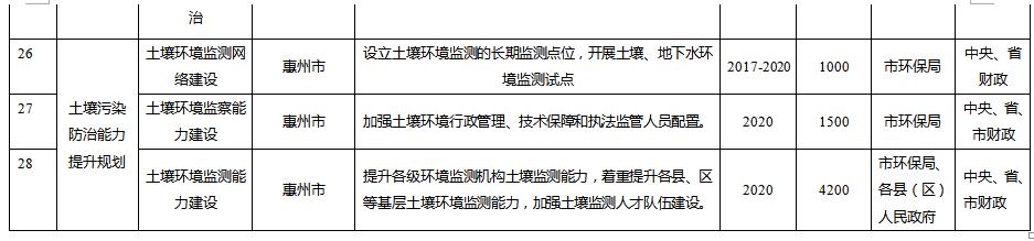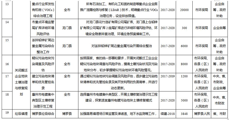 規(guī)劃從惠州市農用地土壤分區(qū)分類管控與治理修復、在產企業(yè)用地土壤環(huán)境風險管控、關閉搬遷企業(yè)地塊土壤治理與修復、垃圾填埋場及周邊環(huán)境整治、工業(yè)園區(qū)風險防范、未利用地保護、土壤污染防治能力提升等方面建設6大類重點項目。其中: