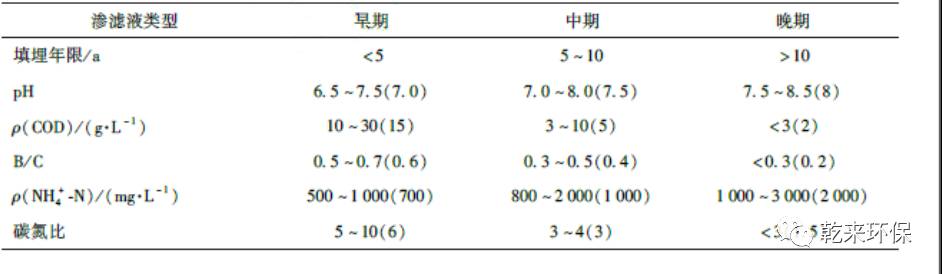 垃圾滲濾液是一種黑色或者黃褐色的帶有惡臭氣味的液體.滲濾液含有大量的有機物和無機物,包括各種難降解有機物(如各種芳香族化合物和腐殖質(zhì)等)、無機鹽(如氨根、碳酸根和硫酸根等)和金屬離子(如鉻、鉛和銅等). 由于垃圾中的成分復(fù)雜,垃圾滲濾液水質(zhì)的特點之一就是污染物含量很高,而且往往含有生物毒性. 其中COD 的質(zhì)量濃度最高可高達20 000 mg/ L 以上,包含苯及其多種衍生物,氨氮的質(zhì)量濃度可達2 000mg/ L. 這種含有有毒有機物和高氨氮的廢水給其處理,尤其是生物處理帶來了極大的困難. 除了有毒的芳香族化合物外,滲濾液還含有大量的腐殖質(zhì)和腐殖酸等大分子有機物. 這些有機物雖然沒有生物毒性,但由于分子量大,具有很好的化學(xué)穩(wěn)定性,微生物無法實現(xiàn)有效的降解,因此,只采用活性污泥法不能實現(xiàn)對滲濾液COD 的有效去除,必須增加深度處理工藝.垃圾滲濾液的另一個特點是水質(zhì)水量變化大. 地域?qū)B濾液的水質(zhì)有很大的影響. 相對來說,歐美國家的滲濾液污染物濃度尤其是氨氮要低于亞洲國家. 歐美國家滲濾液中的氨氮的質(zhì)量濃度一般在1 000 mg/ L 以內(nèi)甚至更低,而亞洲國家的滲濾液氨氮的質(zhì)量濃度一般都在1 000 mg/ L,甚至可以達到5 000 mg/ L.這可能與不同地區(qū)不同的文化和生活習(xí)慣有關(guān).同一地點不同時間產(chǎn)生的滲濾液水質(zhì)差別也很.根據(jù)垃圾填場的場齡不同,垃圾滲濾液可以分為早期垃圾滲濾液(填埋場場齡5 a 以內(nèi))、中期垃圾滲濾液(填埋場場齡5 ~ 10 a)和晚期垃圾滲濾液(填埋場場齡10 a 以上). 不同時期滲濾液的水質(zhì)特點如表1 所示,其中括號中的數(shù)值代表了該項的典型值.