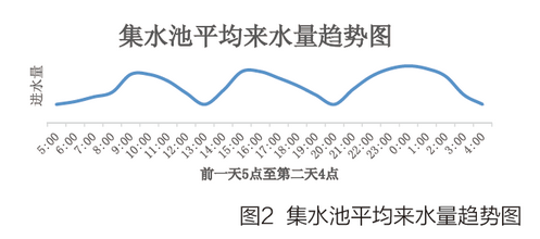 二十四小時(shí)平均進(jìn)水量趨勢(shì)圖如圖2所示,從圖可以看出,在早上7點(diǎn)左右進(jìn)水量逐漸增大,當(dāng)?shù)竭_(dá)十一點(diǎn)左右到達(dá)第一次峰值。這是由于人們?cè)缟嫌盟吭龃螅ǔG闆r下早上七點(diǎn)左右為用水高峰,而通過(guò)管網(wǎng)的延時(shí),導(dǎo)致進(jìn)水量在十點(diǎn)左右到達(dá)高峰。同樣的十三點(diǎn)和第二天零點(diǎn)分別是兩次進(jìn)水高峰。第三次高峰段的延長(zhǎng)是由于這段時(shí)間人們生活所致,例如晚飯時(shí)間用水及洗澡時(shí)間的用水等造成水量的持續(xù)高峰。