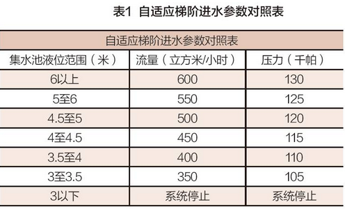 表1是本系統(tǒng)中梯階自適應(yīng)液位與流量壓力的參數(shù)對(duì)照表。這里的壓力與流量是對(duì)應(yīng)的,其壓力是根據(jù)膜的參數(shù)信息進(jìn)行對(duì)照查詢(xún)所得。液位與流量則是通過(guò)粗略計(jì)算和實(shí)驗(yàn)矯正所得。當(dāng)集水池液位大于6米時(shí),存在溢出風(fēng)險(xiǎn),這個(gè)時(shí)候系統(tǒng)滿(mǎn)負(fù)荷運(yùn)行。當(dāng)?shù)陀?米時(shí),為了防止提升泵干抽,我們將停止系統(tǒng)運(yùn)轉(zhuǎn)。