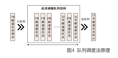 這里我們采用隊(duì)列法來(lái)處理廊道競(jìng)爭(zhēng)問(wèn)題。隊(duì)列法是一種遵循先進(jìn)先出原則的調(diào)度方法。具體原理如圖4所示。隊(duì)列調(diào)度由入隊(duì)列、出隊(duì)列和調(diào)度隊(duì)列空間三部分組成。入隊(duì)列是根據(jù)廊道反洗請(qǐng)求情況將有反洗需求的廊道壓入到隊(duì)列空間的過(guò)程。出隊(duì)列則是根據(jù)當(dāng)前的反洗設(shè)備的運(yùn)行狀況將需要反洗的廊道彈出隊(duì)列的過(guò)程。反洗調(diào)度隊(duì)列空間即扮演一個(gè)存儲(chǔ)調(diào)度序列的角色,同時(shí)其還具有優(yōu)化和排布序列的功能。